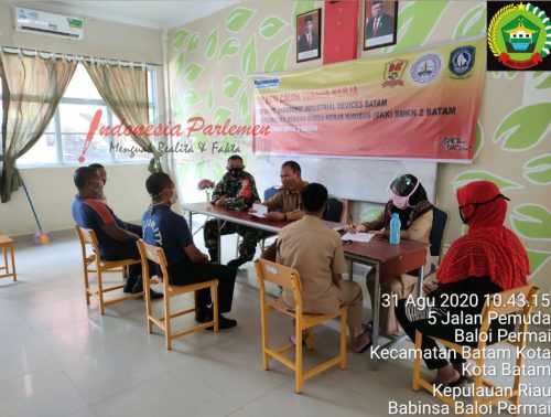 BATAM, INDONESIAPARLEMEN.COM – Babinsa 05 Baloi Permai, Koramil 03/Nongsa, Kodim 0316/Batam, Serda Suratmin melaksanakan komsos penerapan pola kehidupan baru masa pandemi Covid – 19 bersama Guru dan Security SMK Negeri 2 Kelurahan Baloi Permai, Kecamatan Batam Kota, Kota Batam, Senin (31/8/20) pukul 10.30 WIB.