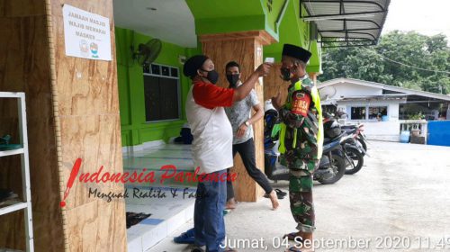 Selama kegiatan komsos berlangsung Babinsa melakukan pengecekan suhu kepada para Jamaah Masjid yang akan melaksanakan Sholat Jumat dengan Thermogun (alat pengukur suhu tubuh).