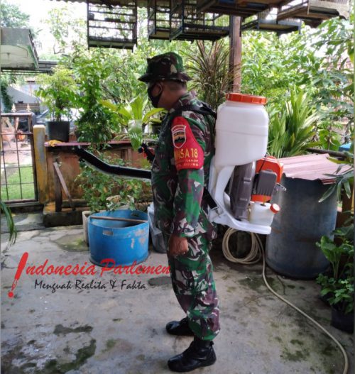 Hari ini kita melaksanakan Penyemprotan Disinfektan di Lingkungan Masyarakat Kavling Pelopor RW.01,” tutur Sertu T. Siburian.