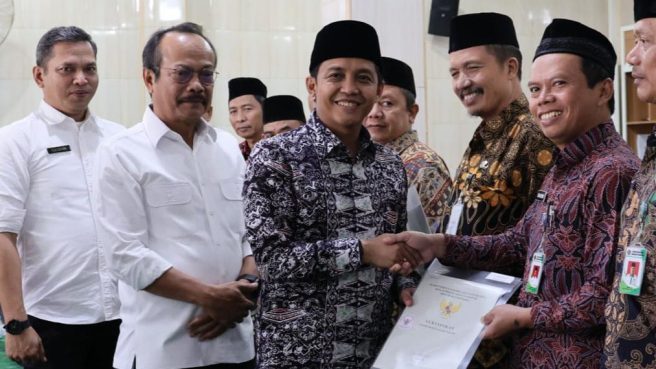 Sertifikat yang diserahkan ini meliputi sertifikat dengan peruntukkan pondok pesantren, sekolah, yayasan termasuk Masjid Jami’ At Taubah Miftahul Jannah yang menjadi lokasi penyerahan sertifikat.