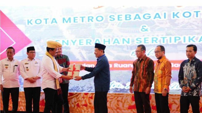 LAMPUNG – Bertepatan dengan momen deklarasi Kota Metro sebagai Kota Lengkap, Menteri Agraria dan Tata Ruang/Kepala Badan Pertanahan Nasional (ATR/BPN), Hadi Tjahjanto juga menyerahkan sejumlah sertifikat aset Barang Milik Daerah (BMD), Badan Usaha Milik Negara (BUMN), tanah wakaf, dan rumah ibadah. Penyerahan sebanyak 305 sertifikat ini berlangsung di Wisma Haji Al-Khairiyah, Kota Metro, Provinsi Lampung, pada Kamis (26/10/2023).