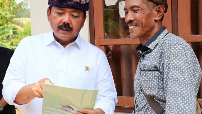 TABANAN – Menteri Agraria dan Tata Ruang/Kepala Badan Pertanahan Nasional (ATR/BPN), Hadi Tjahjanto menyerahkan sertifikat hasil program Pendaftaran Tanah Sistematis Lengkap (PTSL) secara door to door di Desa Abiantuwung, Kabupaten Tabanan, Bali, Senin (06/11/2023). Sebanyak tujuh sertifikat ia serahkan langsung ke rumah warga pemilik tanah.