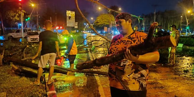 PALANGKARAYA – Tim BPBD Kota Palangka Raya bekerja keras menangani dampak cuaca ekstrem yang melanda kota setempat, Sabtu (25/11/2023) malam.