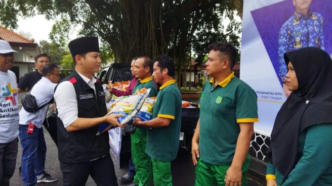 TRENGGALEK – Bupati Trenggalek, Mochamad Nur Arifin atau Mas Ipin, secara simbolis menyerahkan bantuan sembako kepada 10 petugas kebersihan dari Dinas Perumahan Kawasan Pemukiman dan Lingkungan Hidup (PKPLH) Kabupaten Trenggalek, Jumat (1/12/2023).
