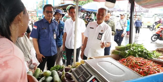 PALANGKARAYA – Pj Sekda Kota Palangka Raya, Arbert Tombak bersama Tim Satgas Pangan Kota Palangka Raya melakukan pemantauan harga bahan pokok di Pasar Besar Kota Palangka Raya, Rabu (20/11/2024).